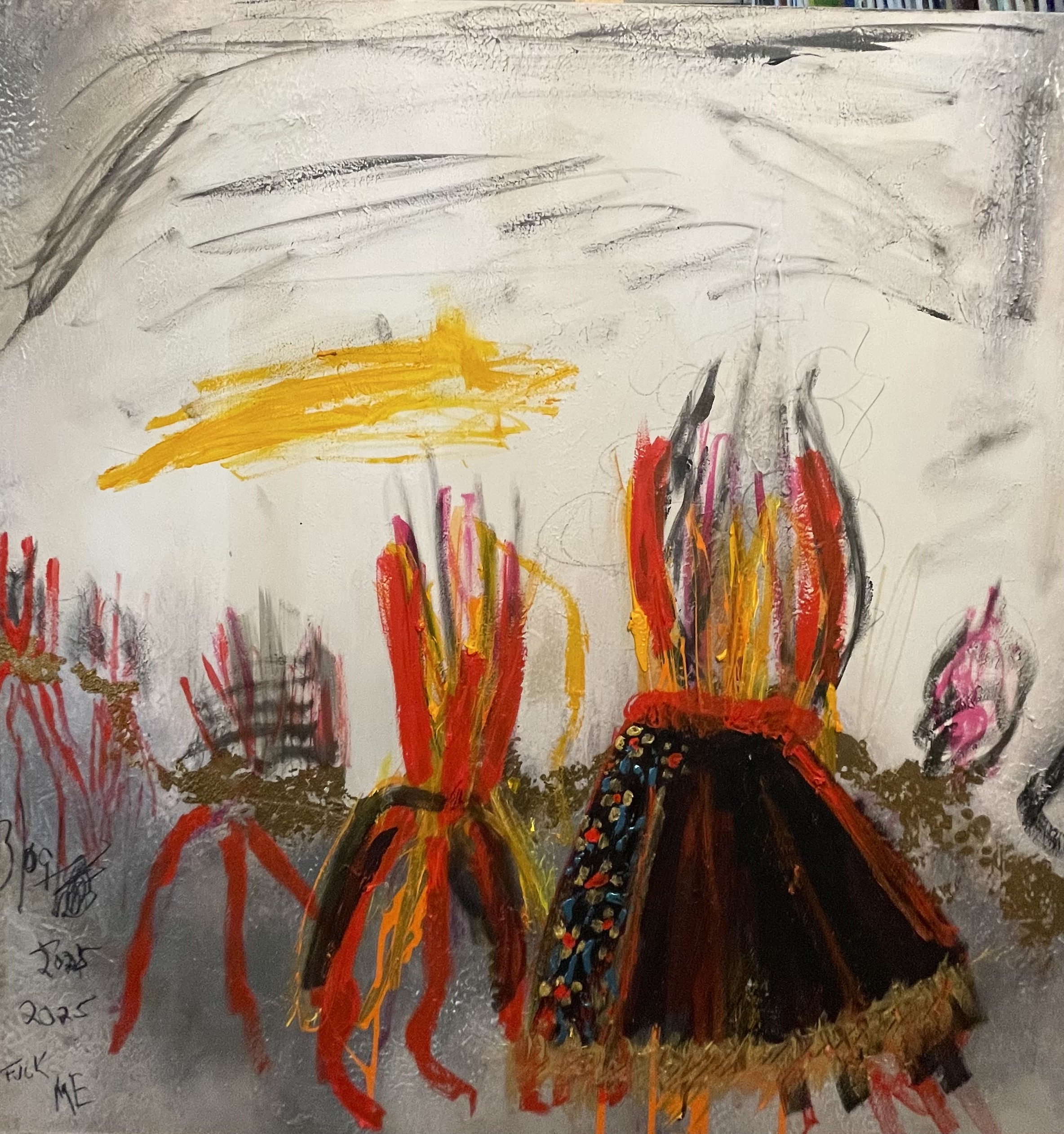 Michael Russo is an artist whose work pulses with raw, unfiltered emotion, drawing art lovers into a world of chaotic beauty and visceral expression. His paintings, often characterized by fiery palettes of colorful tones, paired with aggressive, gestural brushstrokes, evoke a sense of primal energy and transformation. Russo’s style is deeply rooted in the traditions of Abstract Expressionism, reminiscent of the post-war intensity of Jackson Pollock and Franz Kline, yet infused with a Basquiat style contemporary edge through his use of scrawled text and graffiti-like elements. His canvases, serve as emotional battlegrounds where themes of destruction, defiance, and rebirth collide. Russo’s work appeals to collectors who crave art that doesn’t just decorate but demands to be felt, offering a cathartic experience that resonates with the turbulence of modern life.
